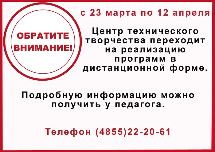 Уважаемые учащиеся и их родители! В период с 29 октября 2021 г. по 07 ноября 2021 г. в учреждениях дополнительного образования устанавливается дистанционный режим обучения (на основании Постановления Правительства Ярославской области от 22.10.2021 №746-п, приказа Департамента образования Администрации городского округа город Рыбинск Ярославской области от 22.10.2021 №053-01-09/372).