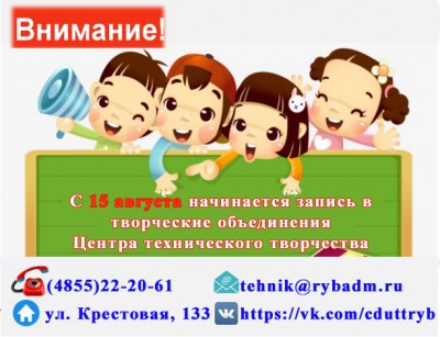 Уважаемые учащиеся и их родители! С 1 июня 2022 года началась приёмная кампания в организациях дополнительного образования Ярославской области. Программы Центра технического творчества, которые будут реализовываться в новом учебном году, находятся на Портале персонифицированного дополнительного образования. Запись на программы будет возможна после открытия групп. Просим следить за изменениями.