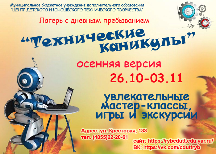 С 26 октября 2020 года на базе Центра технического творчества работает лагерь с дневным пребыванием детей. 30 ребят ежедневно участвуют в увлекательных мероприятиях, которые делают более интересным досуг в осенние каникулы.